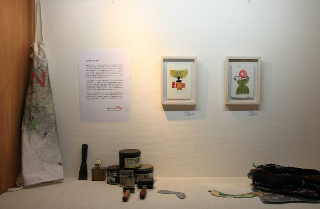 上記の画像は、ある展覧会でN組版画作品が生まれるまでの道具やインク、版、作業