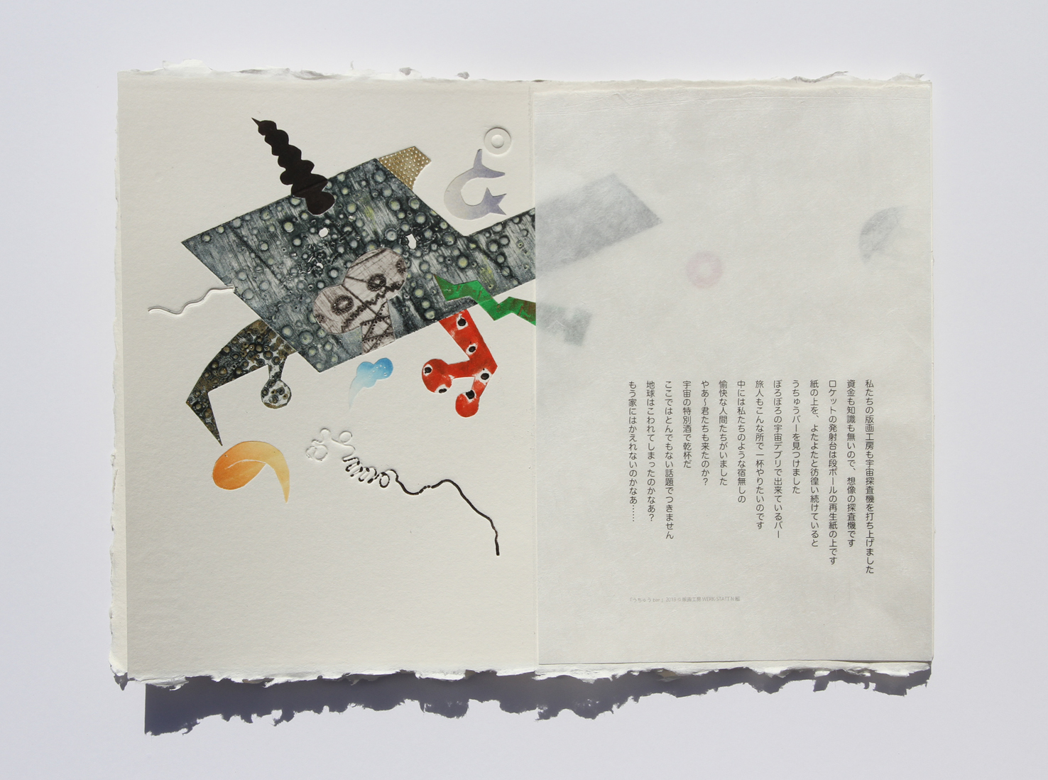 自家製の手漉き版画紙に版画とテキストを組み合わせて刷ることにより、版画により