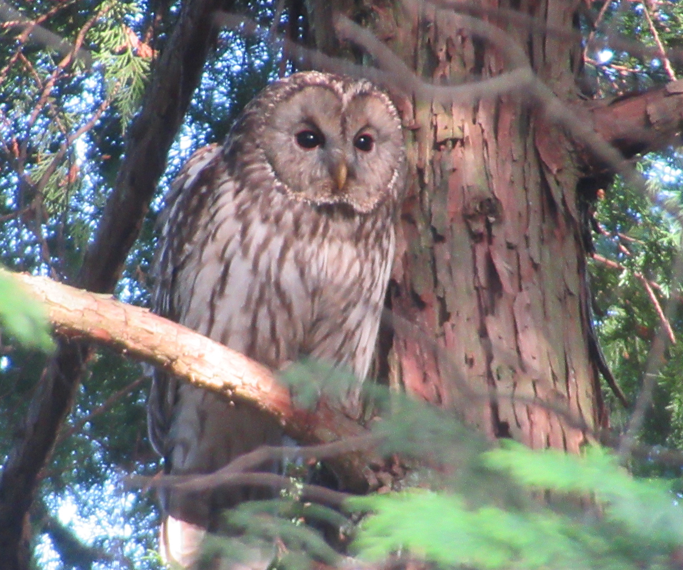 まだ巣立ちを終えていないので、親フクロウが心配して、近くの杉の枝から私た