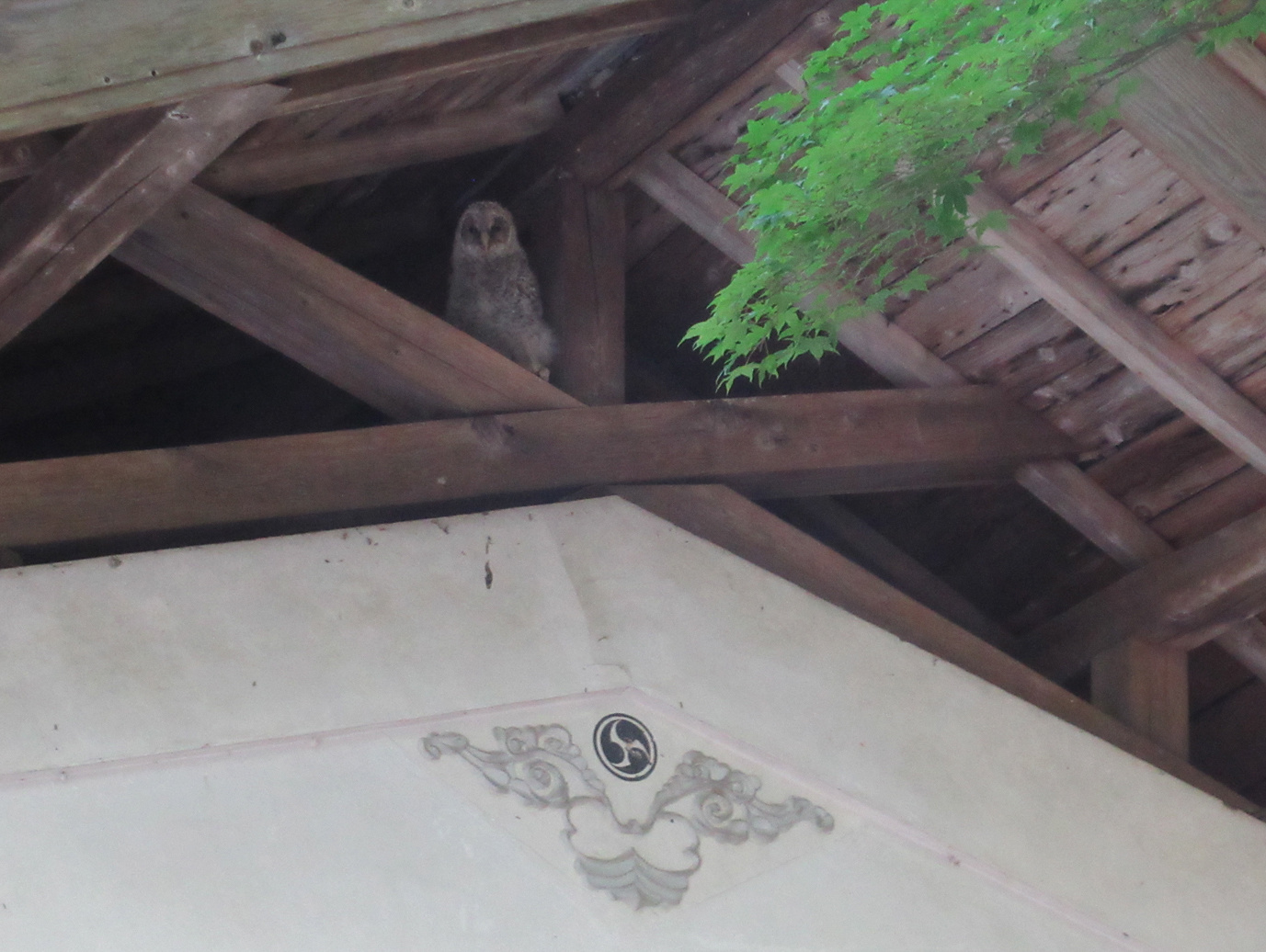 に神社の森で一羽のフクロウの姿を見かけました。神社を参拝しながら境内を動