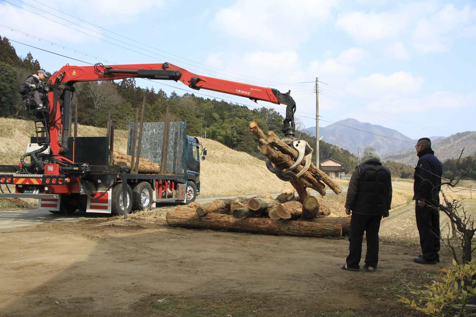 薪ストーブの元となる、落葉樹のクヌギの木が工房前に運び込まれました。