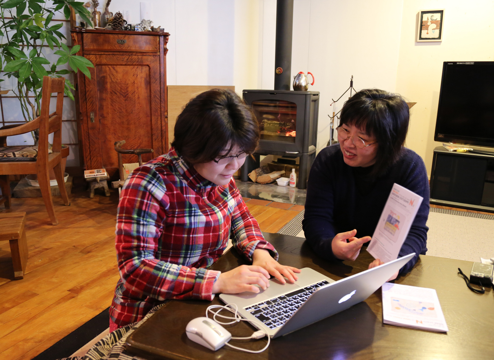 HPなどの広報担当の内藤と中村が、こたつの中で展覧会のリーフレット準備を