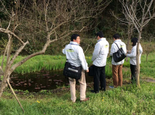 写真はN組工房にあるビオトープを見学している協力隊たち。6月ごろの雨上がり
