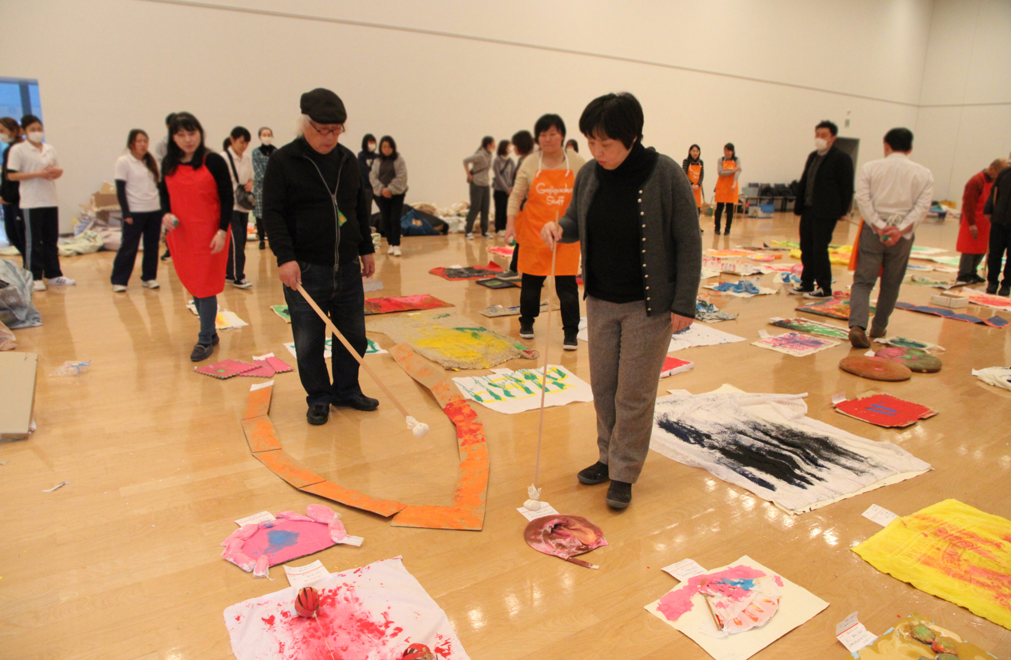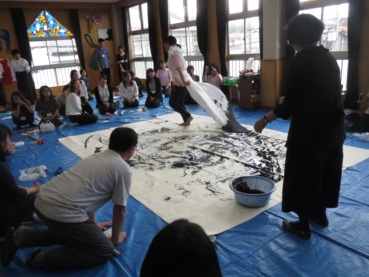 短時間に行なわれた、主催者側で準備した「人間筆」のパフォーマンスもここで紹介致します。現代ダンスのように身体にまとった布が筆の役割をして、布についた墨が動きに従って床にしいた画面に現れるのです。幼い子ども達を指導する保育に携わる先生たちも自由でなければなりません。参加された皆さま方には大きな刺激になった事でしょう。