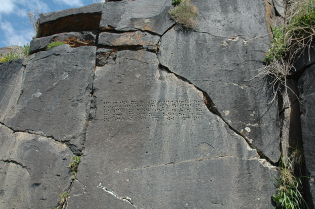 この岩場はDirashen「神の家」と云われる場所で、広大な緑の谷にはアルメニアで一番長いと云われるAkhurian川が静かに流れている。谷の一番上部の見晴らしの良い所にある、岩場「神の家」の壁面には楔形文字で以下の文面が刻まれていた。