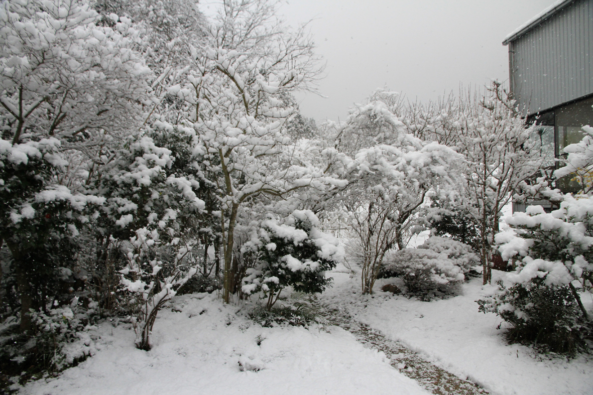 工房の庭は今朝降ったさらさら雪でいっぱい。工房の室内温度は4℃。