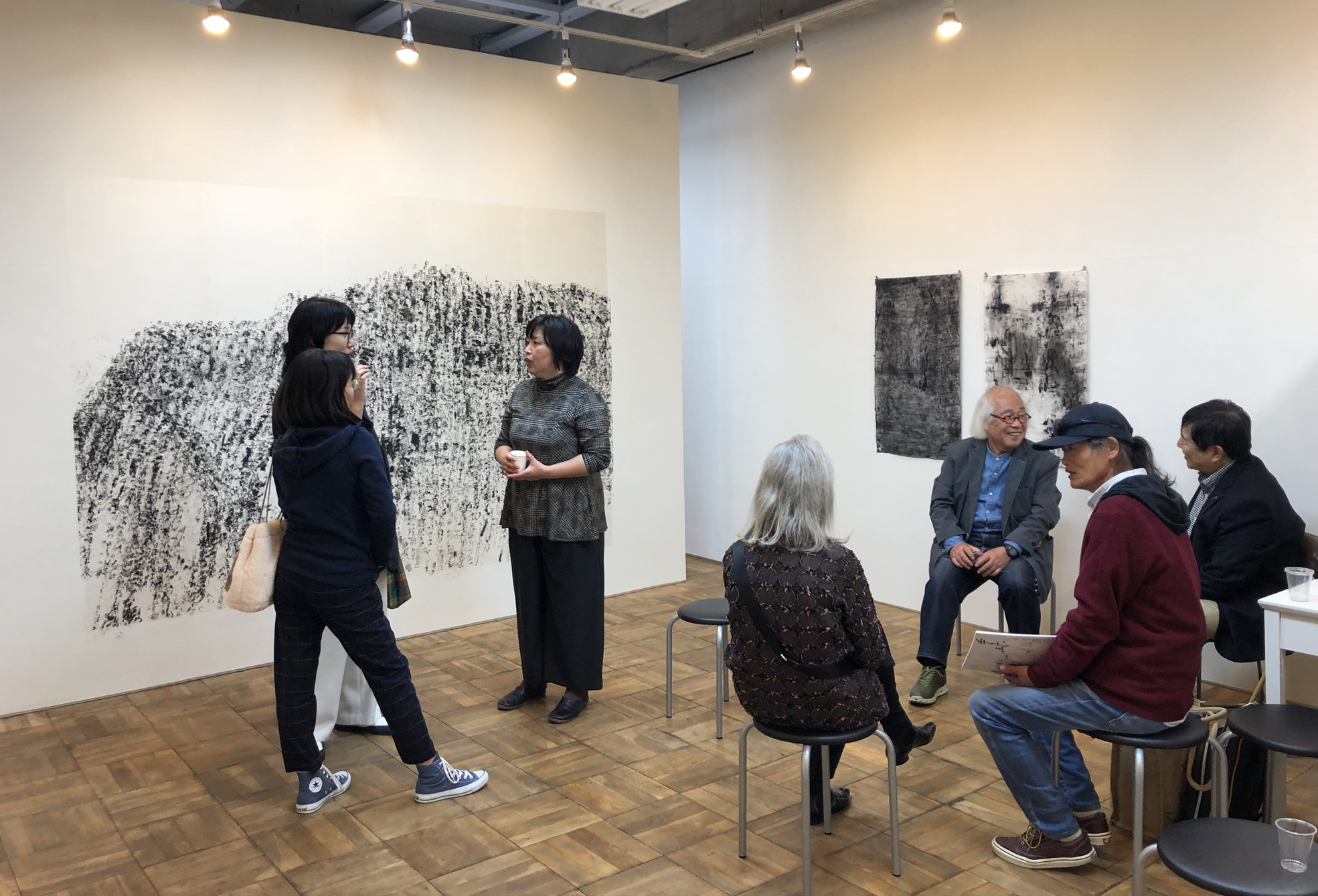 ギャラリー周辺には老舗和菓子店の文明堂や日本初の仕出し弁当店があり、下町の雰囲気が残っています。東京でのN組展は初めてでしたが、地元の人々や長岡先生のご友人のドイツ人作家、精華大版画出身の先輩、そして長野や山梨、神奈川、但馬地方からもお越し頂きました。砂翁(すなのおきな)という素敵なお名前の元、和やかな雰囲気で話が弾みました。地下のキャンドルショップ・トモスにも展示しています。