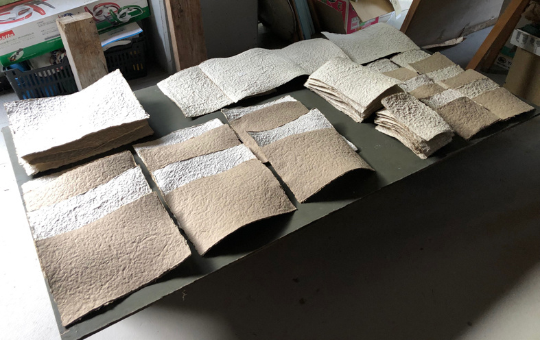 猛暑の中、毎年恒例のオリジナル版画用紙(再生紙)を漉きました。今回も福知山市にある丹後二俣和紙さんから特別に楮100%の繊維を提供して頂きました。