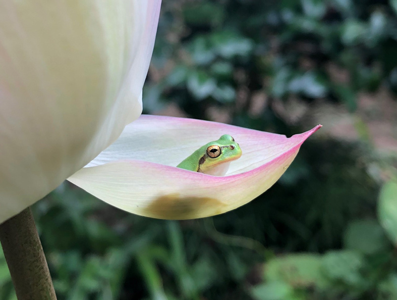 大型の台風10号が迫ってくる直前の作業でしたが、なんとか無事に天日乾燥まで終えることができ、一安心です。やり遂げてホッとしながら、庭のハスの花を見ると、小さなカエルが花びらから顔を覗かせているのを発見しました。出来上がった紙の上に今年も新しい版画作品を刷ります。今日は9月3日から始まる東京の展覧会の準備を