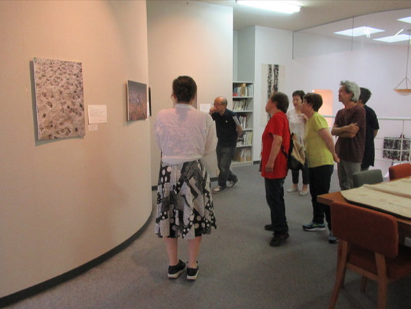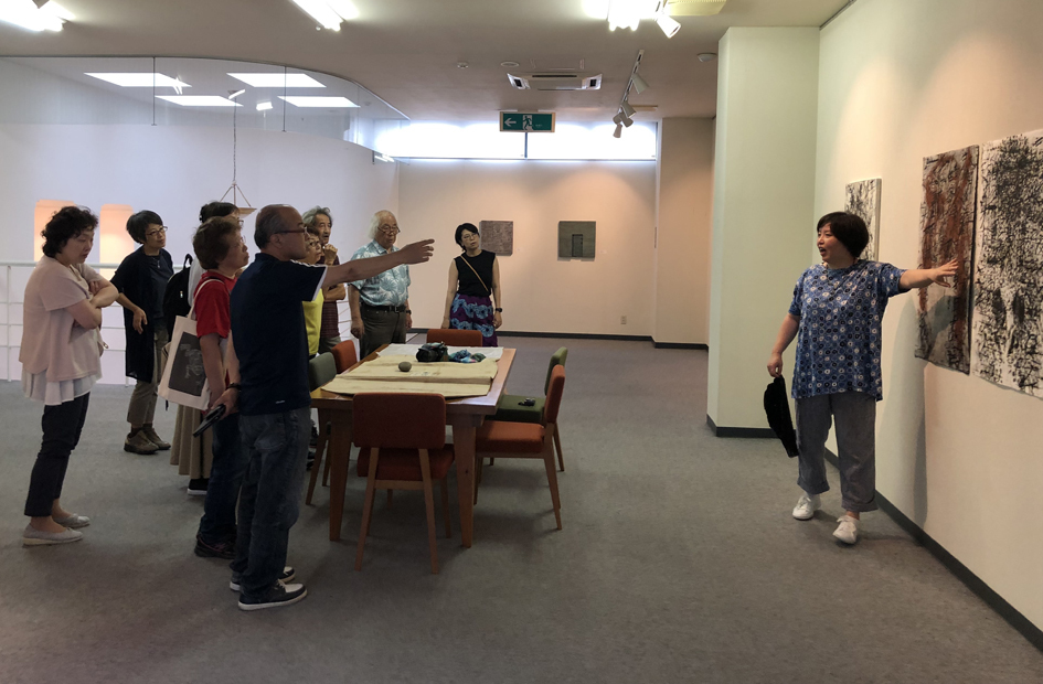 参加者は地元の人々、岡山からも数人、学芸員、コレクターなど個性の強い人々が来てくれて、話が弾みました。皆の前で、N組版画に使う段ボールや使用済みのアルミ版、カナヅチなど並べた所、皆は興味津々です。皆で移動して3Fでは私たち各自の作品の前でいろんな小話をしたら、更に盛り上がりました。