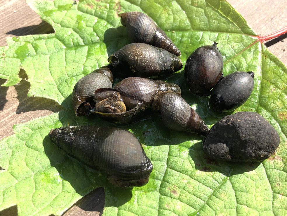 コロナウィルス対処のための自粛も解除され、3ヶ月ぶりにN組スタッフ3名全員が工房に集まりました。私達も再びあらたな版画制作の活動を始めました。昨夜は満天の星の下、工房の横を流れる小川の畔でホタルの乱舞を見学しました。自然は確実に静かに従来の活動を行なっています。川の横は神社の深い森で夜は暗黒の闇で、ホタルのゆっくり動く光がとても綺麗です。私達はホタルの成長することに興味があったので、次の日の昼間に小川の水中観察を行ないました。近くの山から流れ出した冷たい綺麗な水中に、ホタルの幼虫がエサとするカワニナを沢山発見しました。夜のホタルの姿は撮影が難しいので、工房周辺の住人たちとして、水中に住むカワニナを紹介いたします。ちょっとカワニナに失礼して、しばらく撮影のため葉っぱの上に並べてみました。黒々としたカワニナの姿以外にドングリと小石も含まれます。さて何匹カワニナがいるでしょうか?もちろん撮影後に、すぐにもとの小川に戻しました。