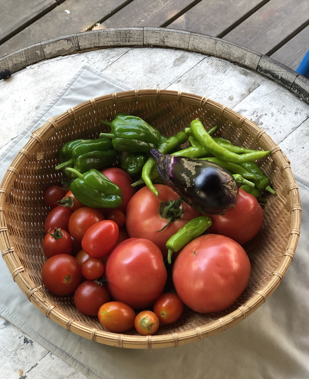 涼しい早朝から作業を始めると、暑い昼にはお腹がすっかり空いてきます。昼食には冷たい氷の上のソウメンに限ります。数年前に柚子の木の下に植えたミョウガの株も大きく育っているので、もしやミョウガの花が咲いているのではと思いつき、根元近くの薄暗い所に目をやると、何とミョウガの白い花を幾つか発見。これこそソウメンの具には最高です。庭の薮の中には毒蛇のマムシも徘徊しているので、簡単には手も出せません。まずは竹棒でバタバタと地面をたたき、すっと手を出してミョウガを素早くゲットです。すぐに細かく刻んで3人分のソウメンの具になりました。この暑い真夏の昼食には最高の味です。それに氷で冷やした自家栽培のトマトを丸ごとかじるのも格別です。