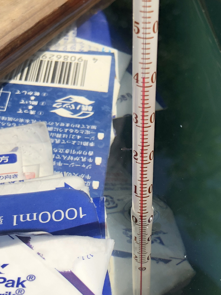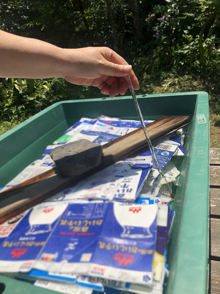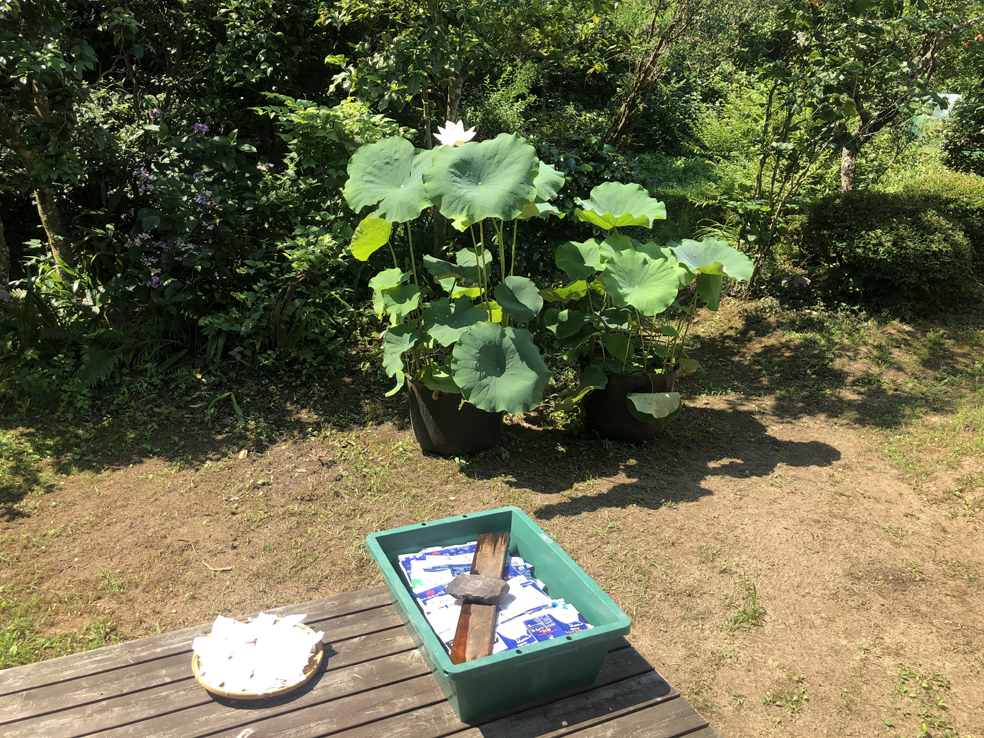 20日の朝には庭の蓮の花が初めて開花しました。毎年8月初期のN組紙漉きの時期にはきまって蓮の花が沢山咲いて、早朝の庭で花の香りを嗅げるのは特別です。例年は段ボールなどの再生紙を元にN組版画工房独自の手漉き版画用紙を作るのですが、追加で沢山たまった牛乳パックの再生紙も今年は作る予定で準備が始まりました。牛乳パック外側のコーティングされたポリエチレンフィルムをパルプから剥がすためには本来は鍋で煮るのですが、真夏の太陽熱で水の温度をあげて試してみることにしました。いわゆる天然の太陽熱エネルギーを使うのです。今日の日中の温度は40℃を超え、何と42℃の温水になっていました。沸騰とはいかないですが、この温度で試みてみよう。手間ばかりかかるのですが、N組は廃棄された物を再利用してRe-Recycleをモットーにして紙や版画を創っているのだから当然の試みです。