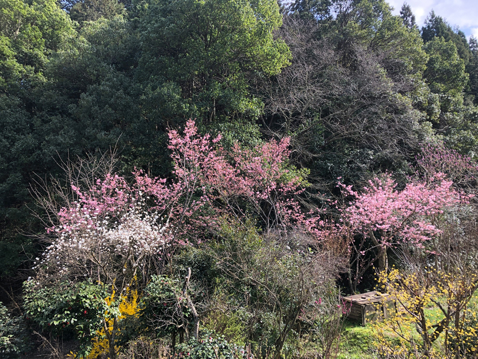 黄色のレンギョ、山茱萸、赤色のヤブツバキ、ピンクの桜、白色のヒメコブシ、