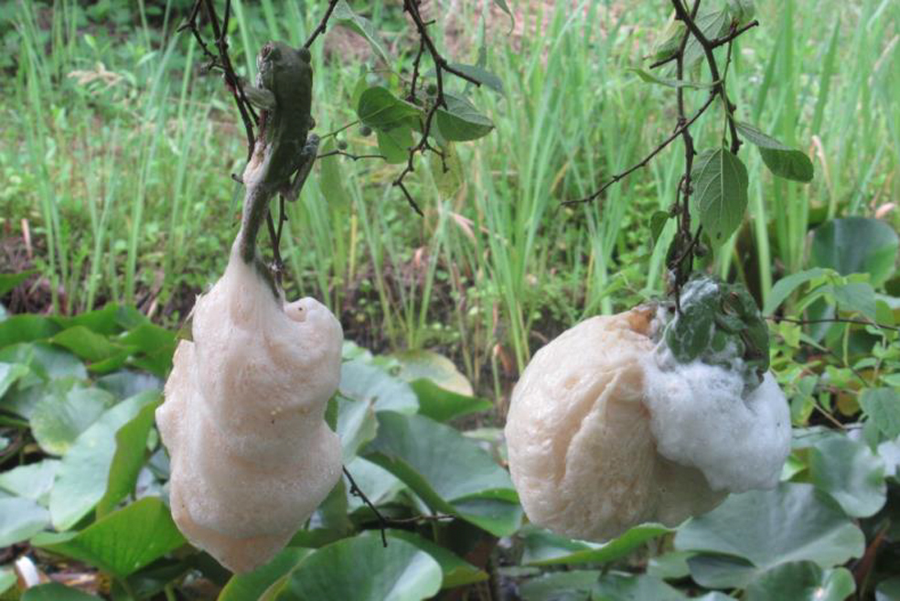 畑の隅にあるビオトープにモリアオガエルの産卵が始まっています。5月23日