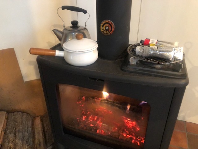 期の薪ストーブ上はお茶用のヤカンや昼のスープの鍋などで一杯です。作業中、